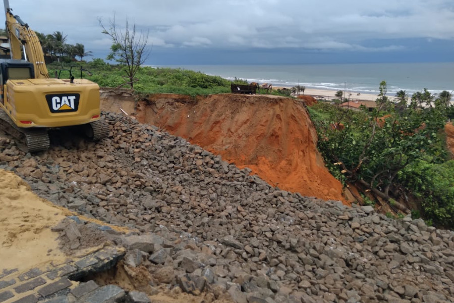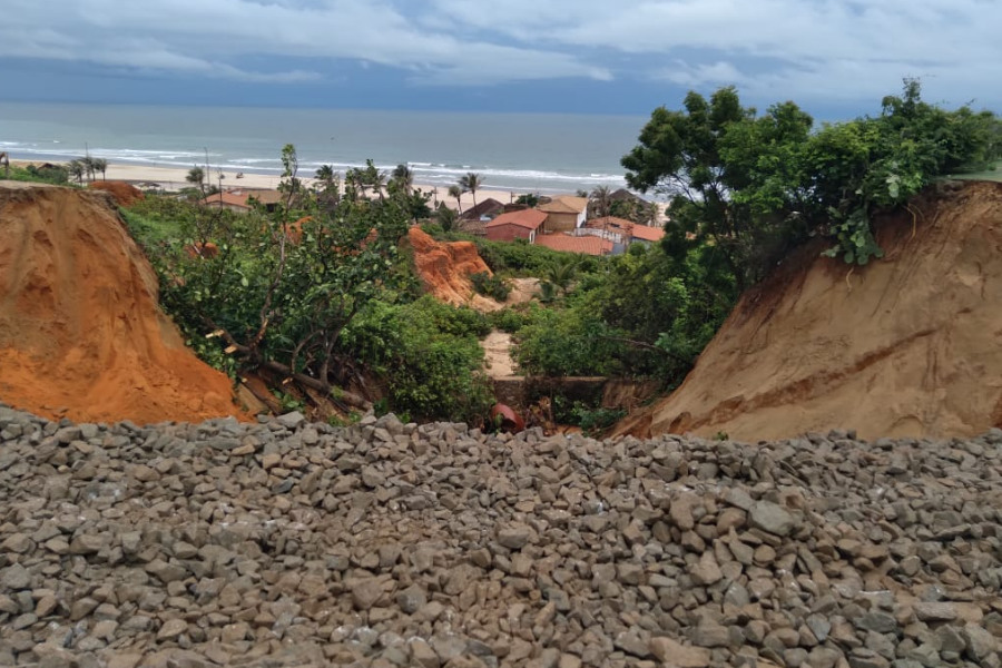 De acordo com as informações do professor Rubson Maia, que esteve no local e fez imagens da situação nesse fim de semana, a Prefeitura fez uma estabilização provisória com manto de pedra tosca: “Nada definitivo, mas diminui um pouco a chance do avanço imediato da erosão”.